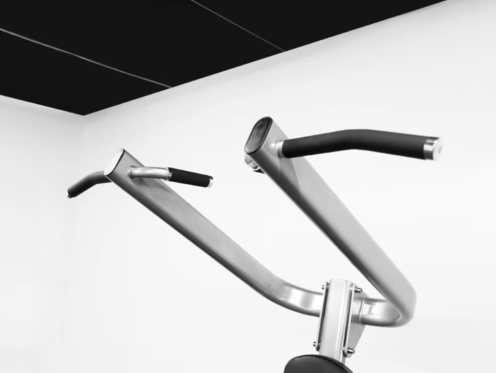 Two sets of angled hand grips for dip and vertical knee raise exercises