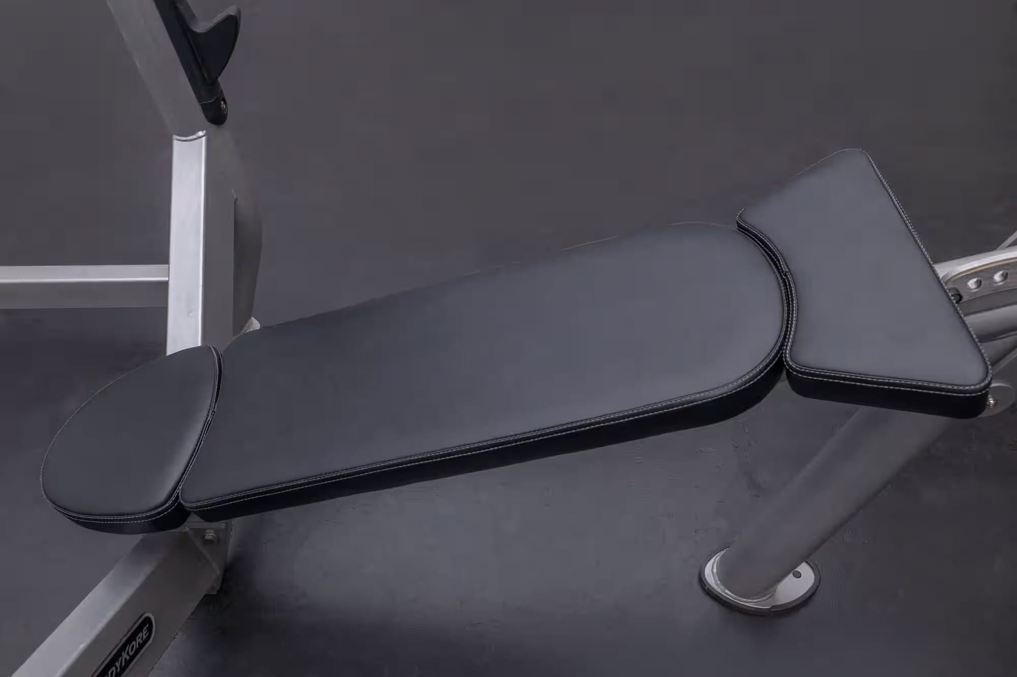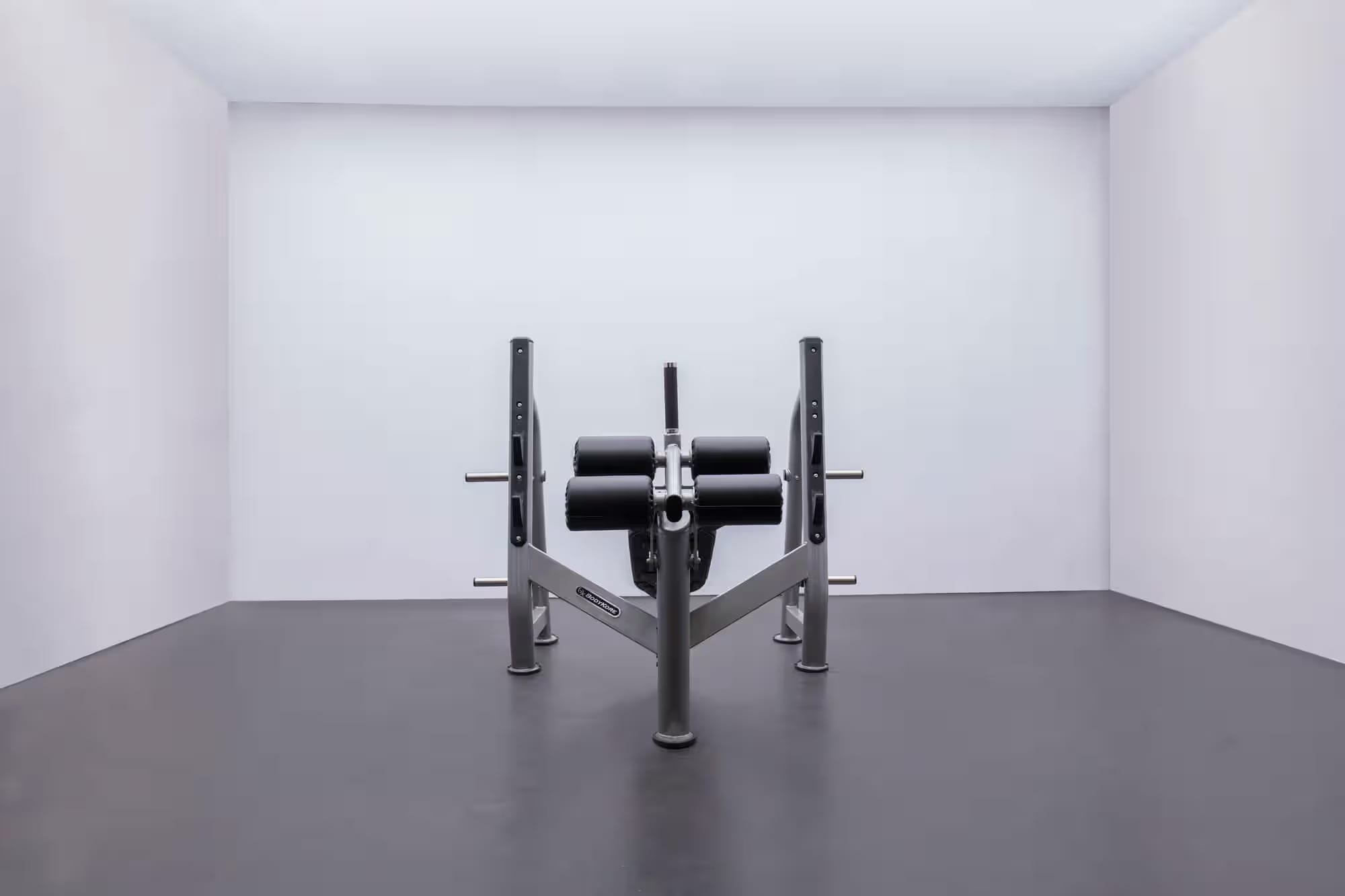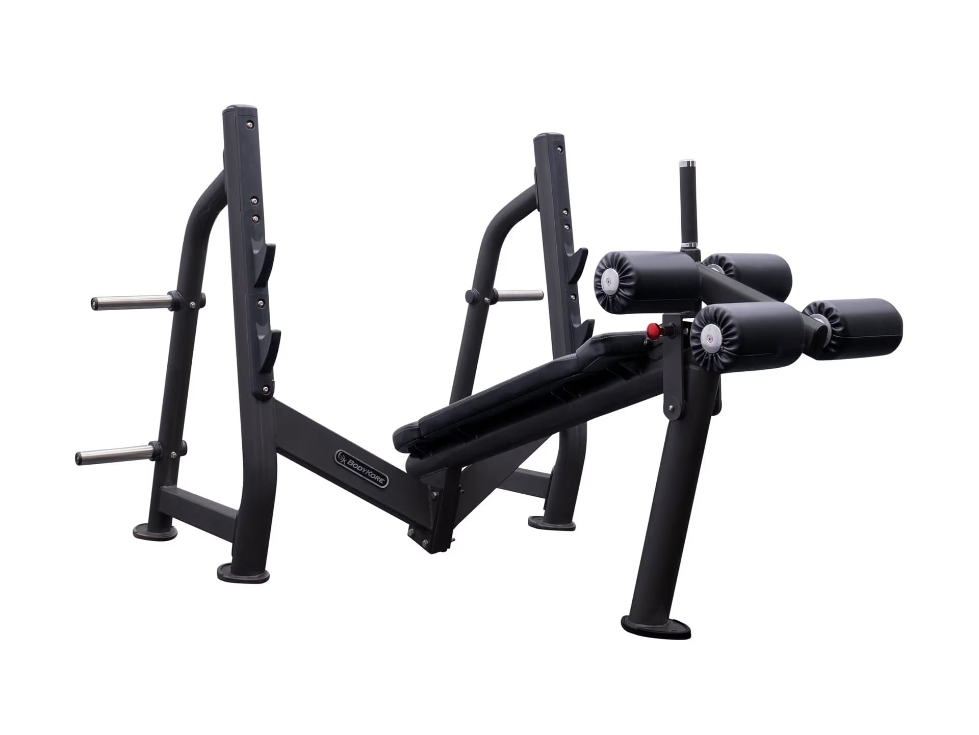 Our CF2153 Olympic Decline Press is a commercial Olympic press made for club use. The sleek futuristic design comes in black or silver and is extremely heavy duty and can hold over 1000lbs in total. The bar hooks are made of an extremely durable polyurethane material and made to last. The wide design of the bench also provides maximum stability. Our CF2153 Olympic Decline Press features rubber feet on its base, which protects user’s floors from becoming damaged. This press includes a powder coat finish and polyurethane bar holder protectors, making it durable and abrasion resistant. This bench is commercial grade and rated to hold over 1000lbs.
