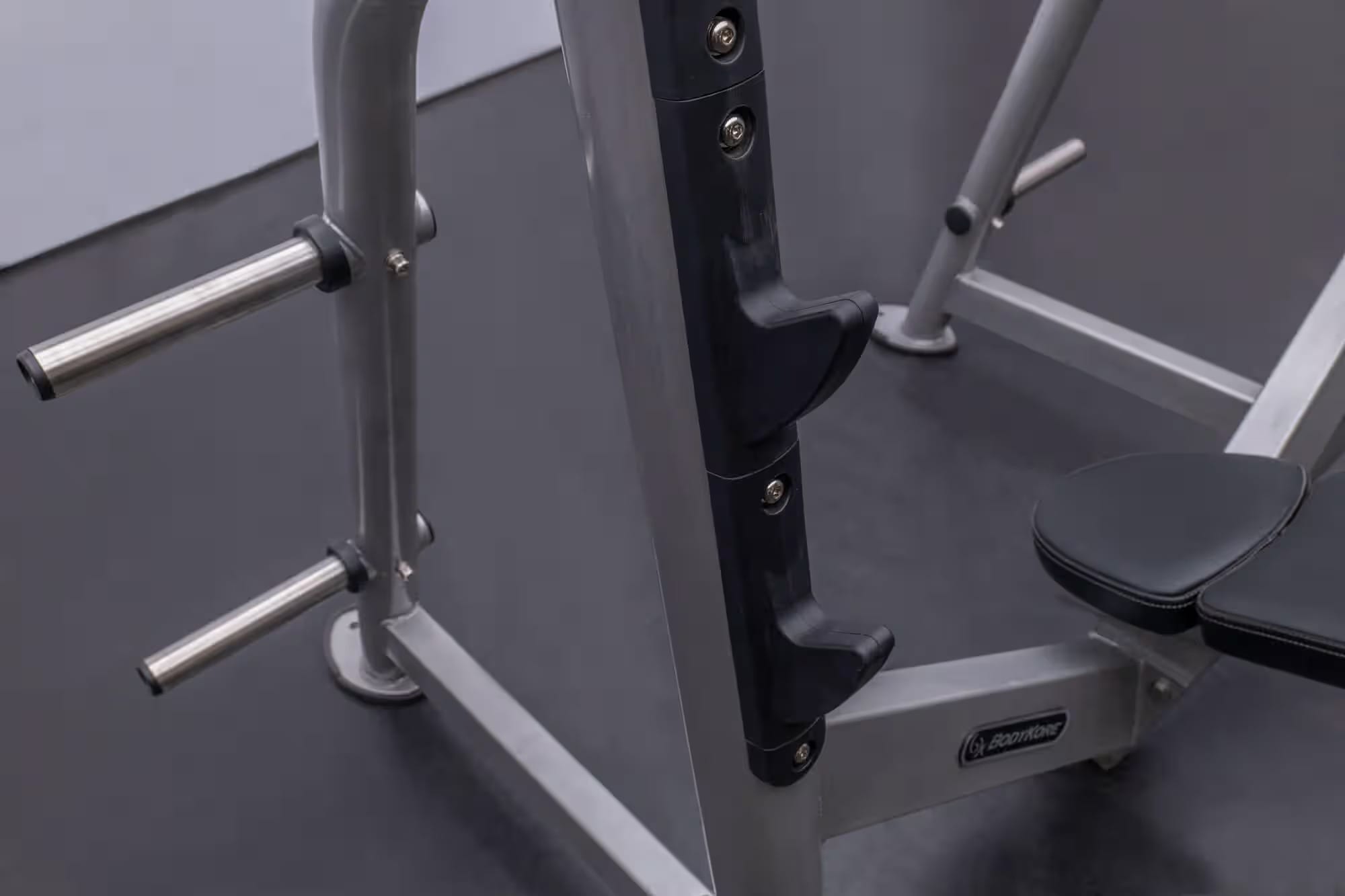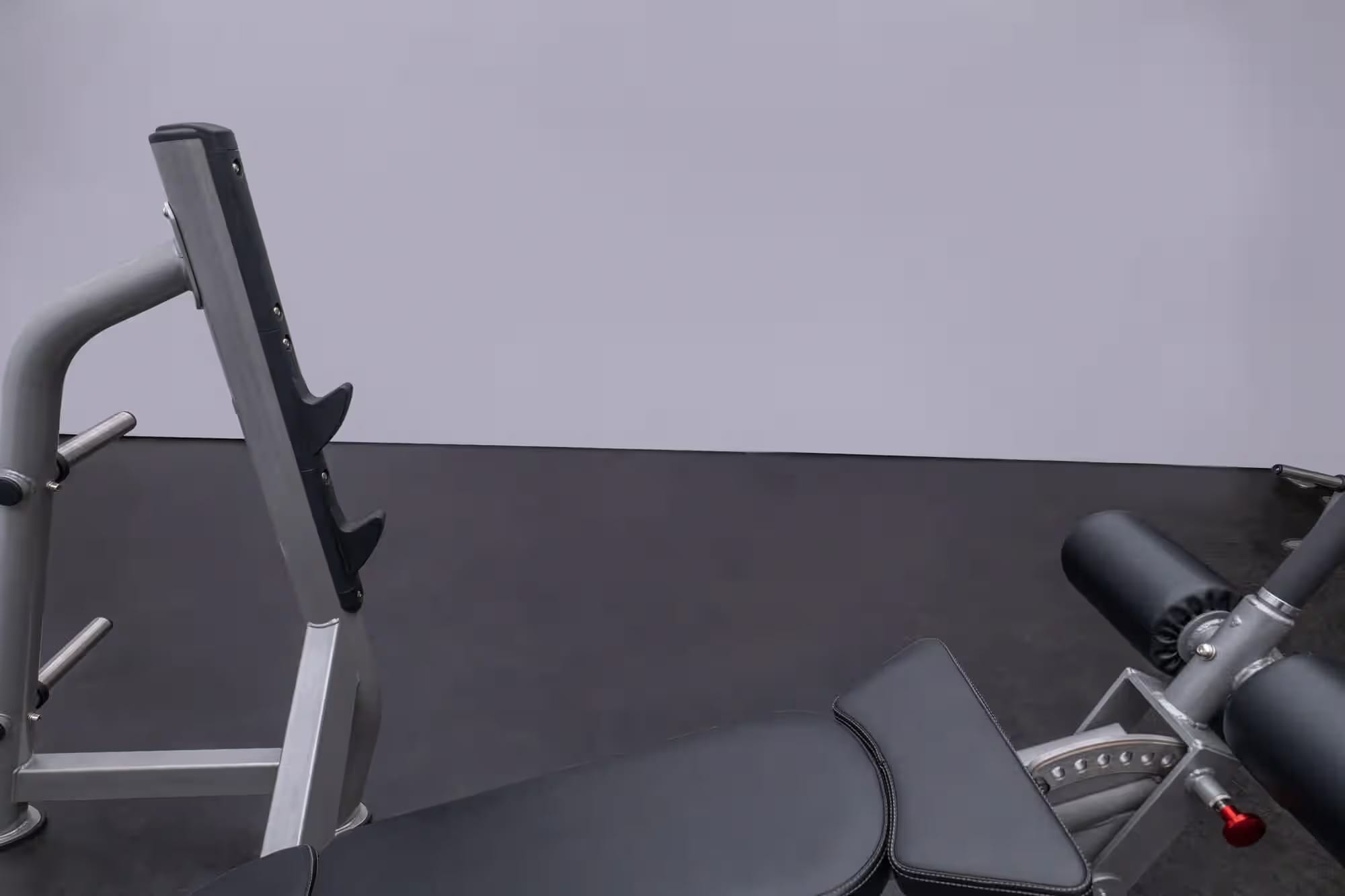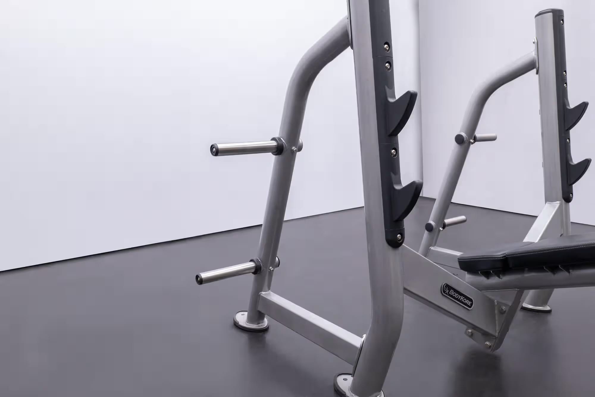 Our CF2153 Olympic Decline Press is a commercial Olympic press made for club use. The sleek futuristic design comes in black or silver and is extremely heavy duty and can hold over 1000lbs in total. The bar hooks are made of an extremely durable polyurethane material and made to last. The wide design of the bench also provides maximum stability. Our CF2153 Olympic Decline Press features rubber feet on its base, which protects user’s floors from becoming damaged. This press includes a powder coat finish and polyurethane bar holder protectors, making it durable and abrasion resistant. This bench is commercial grade and rated to hold over 1000lbs.