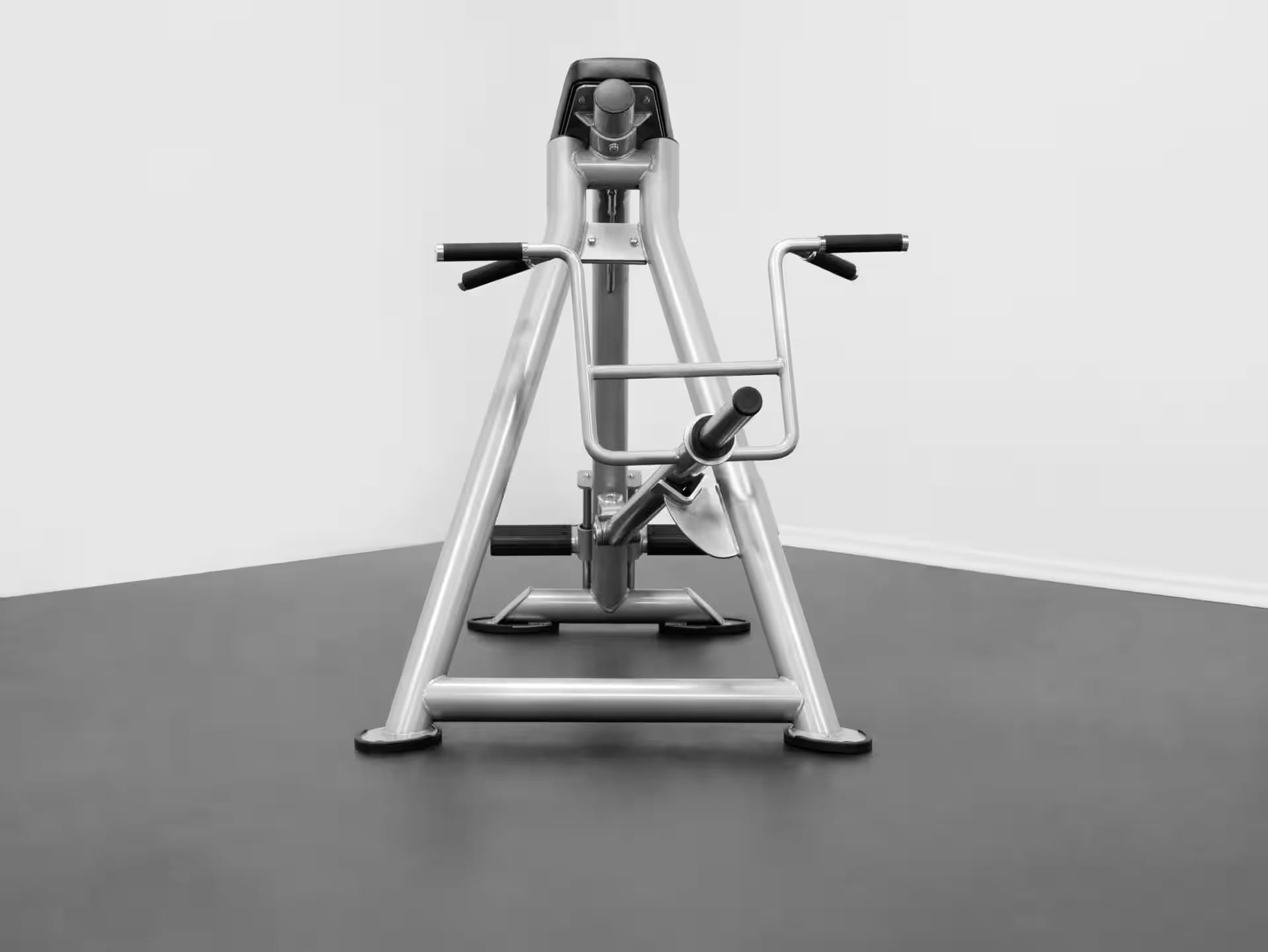 Chest pad and foot plates secure upper torso to isolate lats/rear deltoids