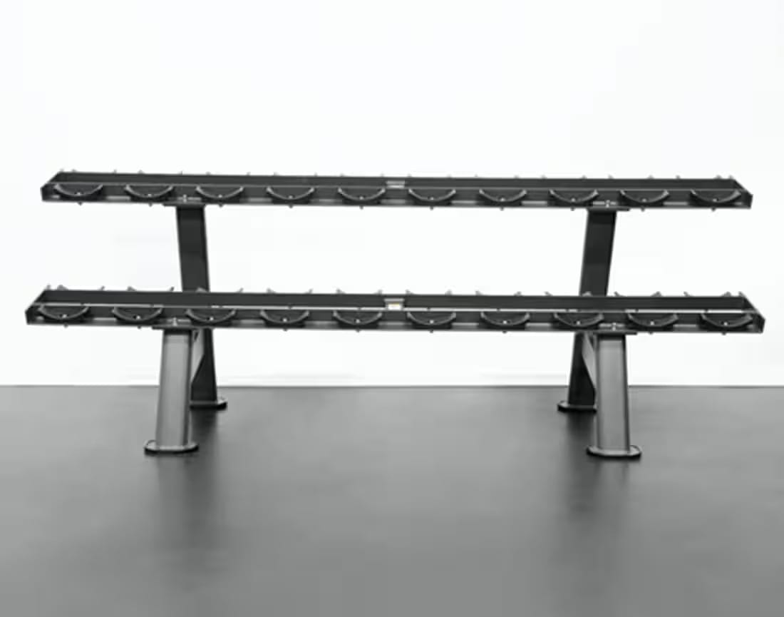 The G231 dumbbell rack fits 10 pairs of Pro Styled Dumbbells. The rack is built with a commercial oval tubing frame, and the shelves has saddles for the dumbbells to sit in. If you’re looking for expert-level equipment for building strength, the 2 Tier Pro Dumbbell Rack is the way to go. This rack is commercial grade and rated to hold over 1000lbs