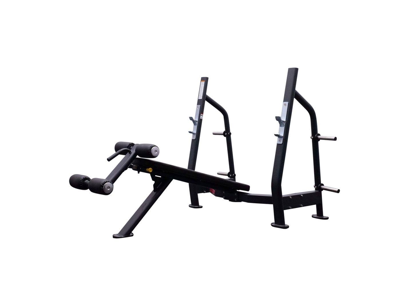 Our G252 Olympic Incline Bench is a commercial Olympic bench made for club use. The stylish timeless design comes in black and is extremely heavy duty and can hold over 1000lbs in total. The bar hooks are made of an extremely durable zinc plated steel and made to last. The bench’s wide design also provides maximum stability and has adjustable leg holders for users of different heights. This bench is made for standard length 7’ Olympic Bars. This bench is commercial grade and rated to hold over 1000lbs.