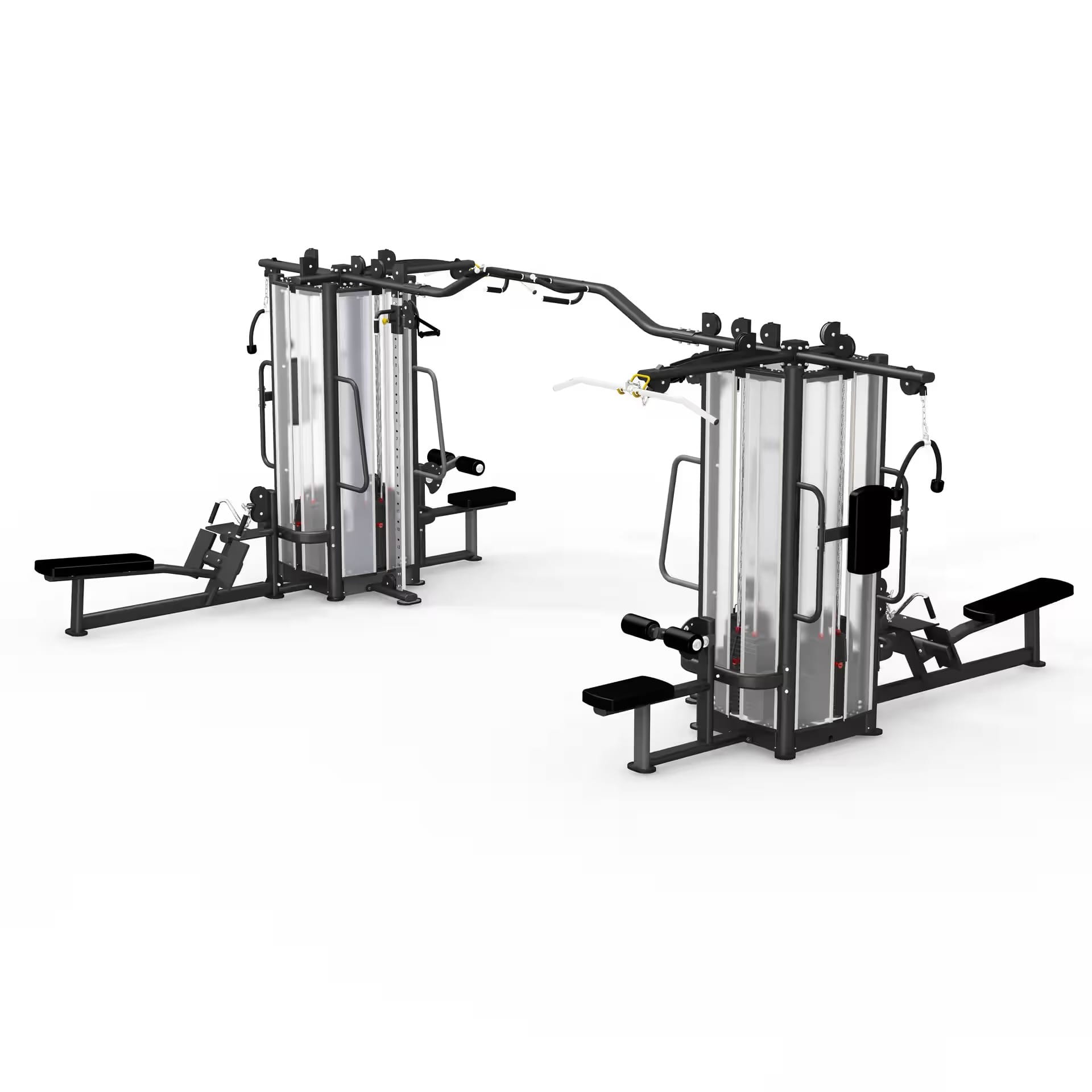 This 8 station jungle gym is multi-dimensional strength training. The stations include (2) lat pull down stations, (2) seated row stations, (2) tricep stations and cable cross. Each station is equipped with 220lb weight stack and the cable attachment used in the station. This machine is commercial grade and rated to hold over 1000lbs.