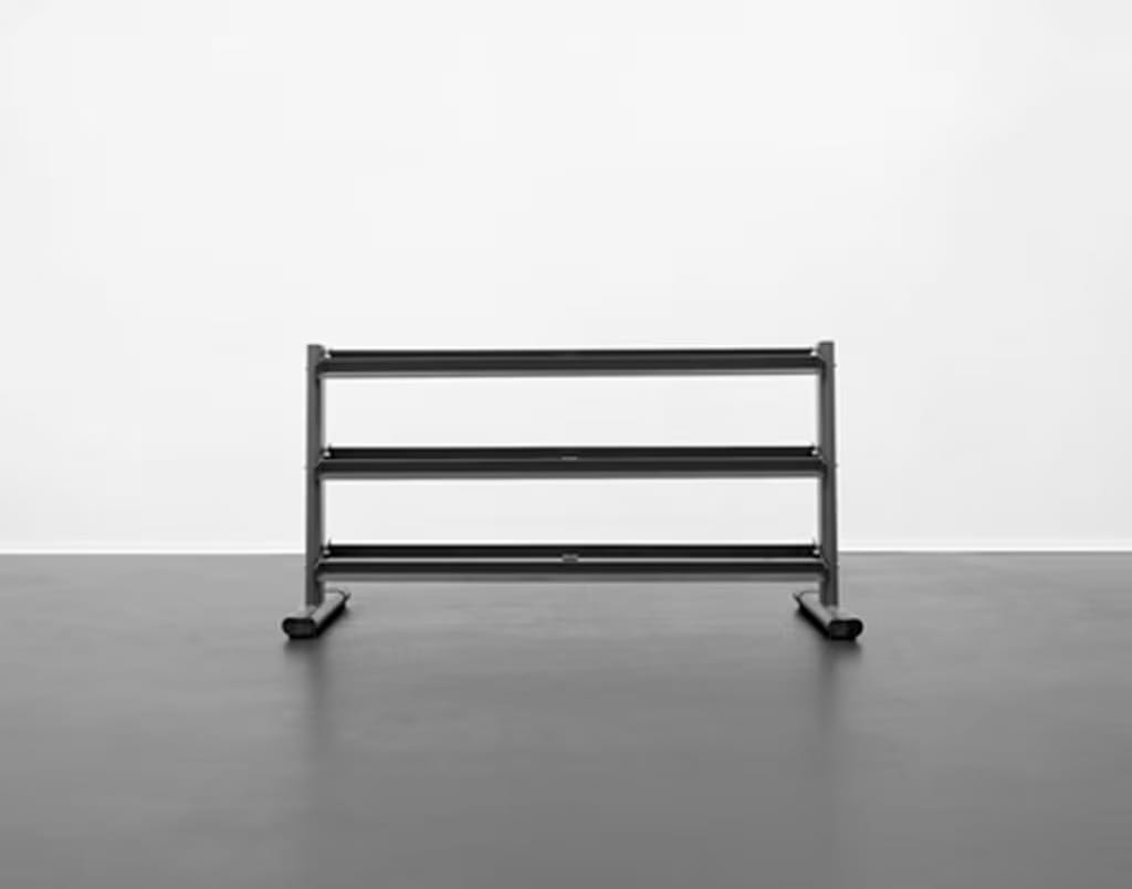 14 pairs of dumbbells from 5lb to 70lb in 5lb increments w/ G242 3 Tier Rack